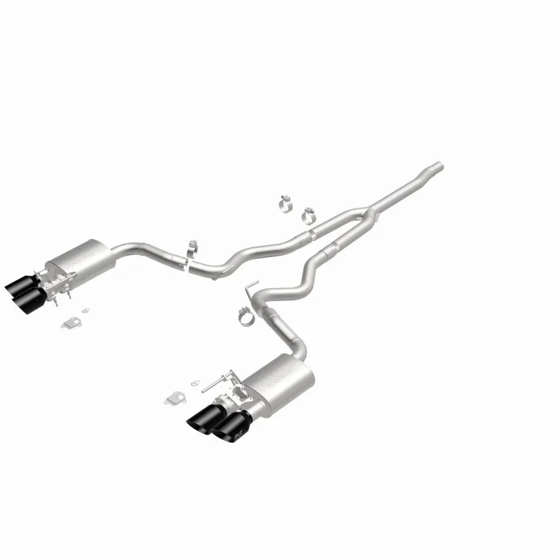The MagnaFlow 2024 Ford Mustang Ecoboost Competition Series Cat-Back Performance Exhaust System brings an aggressive, attention-grabbing edge to the deep resonant exhaust note we're so well known for. This Ford Mustang cat-back exhaust kit is designed to enhance your 2.3L 2024 Ford Mustang Ecoboost with dyno-proven performance made possible thanks to fast-flowing mandrel bent 2.5in. diameter piping that passes 2 all-new dyno-proven performance chambered mufflers ending in a quad split rear exit with 4in. welded-on double wall angle cut folded edge tips featuring a sporty black chrome finish. The direct-fit design allows for an easy, do-it-yourself installation process. Exhaust system 19640 is engineered to make your Ford Mustang's engine produce moderate interior and aggressive exterior sound levels, befitting its competition-oriented design. 19640 is made of 100% durable and corrosion-resistant stainless steel and produced using CNC precision robotic manufacturing, all backed by MagnaFlow's 1-year limited finish warranty and limited lifetime construction warranty. Please check to ensure compliance with local noise regulations.