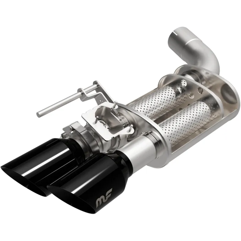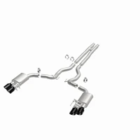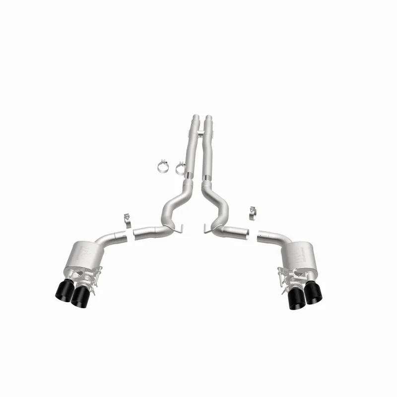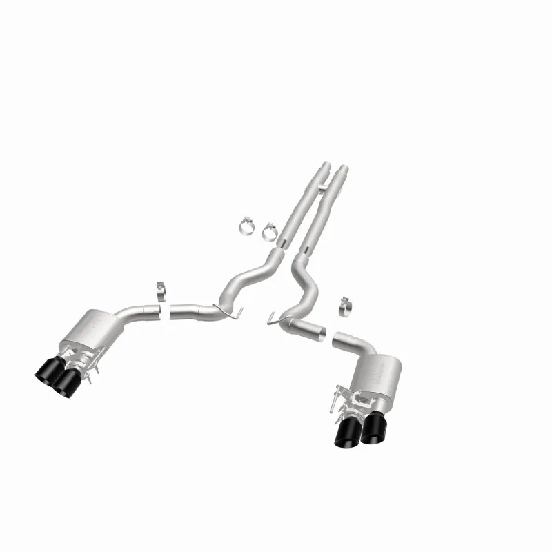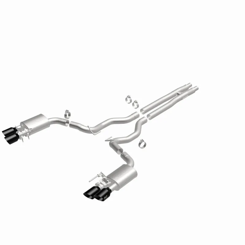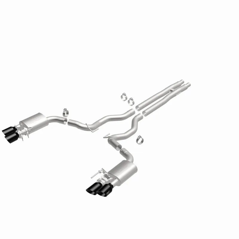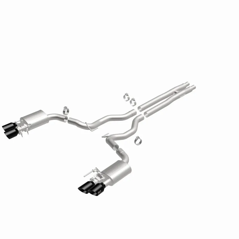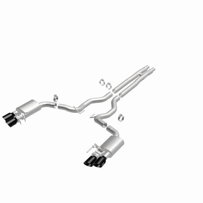 The MagnaFlow 2024 Ford Mustang GT Competition Series Cat-Back Performance Exhaust System brings an aggressive, attention-grabbing edge to the deep resonant exhaust note we're so well known for. This Ford Mustang cat-back exhaust kit is designed to enhance your 5.0L 2024 Ford Mustang GT with dyno-proven performance made possible thanks to a resonator-delete H-pipe, fast-flowing mandrel bent 3in. diameter piping that passes 2 all-new dyno-proven performance chambered mufflers ending in a quad split rear exit with 4in. welded-on double wall angle cut folded edge tips featuring a sporty black chrome finish. The direct-fit design allows for an easy, do-it-yourself installation process. Exhaust system 19643 is engineered to make your Ford Mustang's engine produce moderate interior and aggressive exterior sound levels, befitting its competition-oriented design. 19643 is made of 100% durable and corrosion-resistant stainless steel and produced using CNC precision robotic manufacturing, all backed by MagnaFlow's 1-year limited finish warranty and limited lifetime construction warranty. Please check to ensure compliance with local noise regulations.