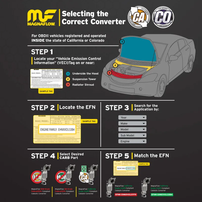 MagnaFlow specializes in superior catalytic converter and exhaust technology and has spent the past 30+ years earning its reputation as a global market leader. American engineered and manufactured, MagnaFlow Catalytic Converters combine efficient industrial design to produce a product that exceeds, rather than meets, the highest standards of product performance and efficiency in the industry. MagnaFlow uses both Ceramic and Metallic substrates with different combinations of cell density and wall thickness to meet vehicle specific requirements. MagnaFlow Direct-Fit Catalytic Converters are designed for easy bolt-on installation for the Professional Installer. Each is designed to exact the original equipment specifications. While the majority of the Direct-Fit Catalytic Converter products do not require welding, cutting or bending, limited applications may require additional welding for optimal installation. All Federal catalytic converters meet EPA requirements. Federal Catalytic Converters are not legal for sale, installation or use on vehicles registered in the state of California. All California State Catalytic converters are CARB compliant. Converters in this catalog are based on Executive Orders issued by the California Air Resource Board and must be used in accordance with this information. In California, it is illegal to select a catalytic converter for installation based solely on vehicle weight and engine size. * Stainless steel construction * Formulated for Gas and Diesel Applications
