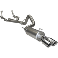 It features twin 2.5” pipes off the turbos, running through a set of high flow catalytic converters, and then into your choice of either a high-flow muffler, or just a straight pipe, where it merges into a 3” single pipe, before going over the axle, through a high-flow rear muffler which control any drone, and finally you have the choice of either a twin 3.5” chrome, or single 4” exit.