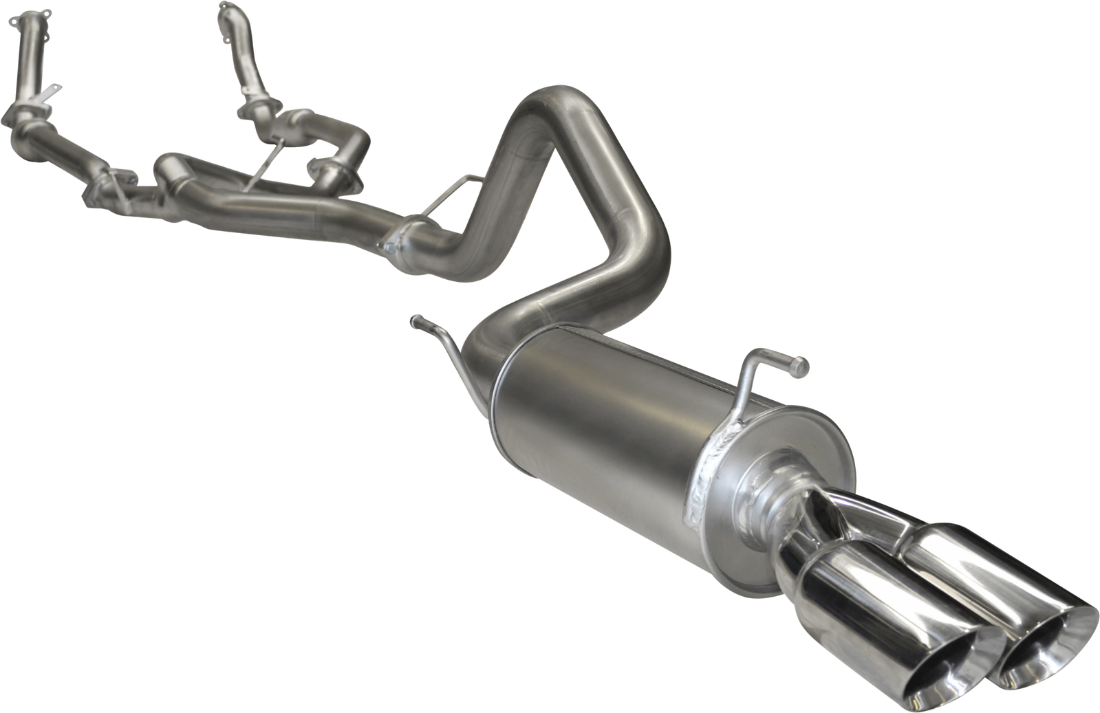 It features twin 2.5” pipes off the turbos, running through a set of high flow catalytic converters, and then into your choice of either a high-flow muffler, or just a straight pipe, where it merges into a 3” single pipe, before going over the axle, through a high-flow rear muffler which control any drone, and finally you have the choice of either a twin 3.5” chrome, or single 4” exit.