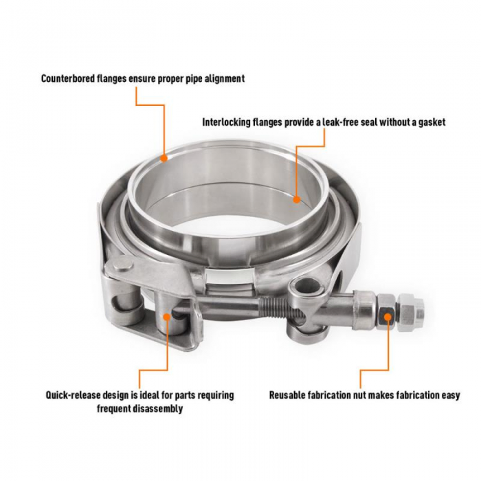 Mishimotostainless Steel V-Band Clamps are some of the strongest and most reliable clamps on the market. Tailored especially for the fabricator, this 2 stainless steel V-band clamps provide a rigid and secure connection between intake, intercooler pipes, and exhaust pipes. The V-band design makes assembly and disassembly a breeze, and the included fabrication nut makes mock-up easy. Simply assemble the V-band clamp with the reusable nut, tack-weld your pipes in place and disassemble for final welding. Once you?re done welding, assemble the clamp with the provided locking nut and never worry about loosening. The stainless steel construction resists heat and corrosion, while the 360-degree clamp ensures leak-free running. Like all our clamps, this 2 stainless-steel V-band clamp is backed by our Mishimoto Lifetime Warranty.