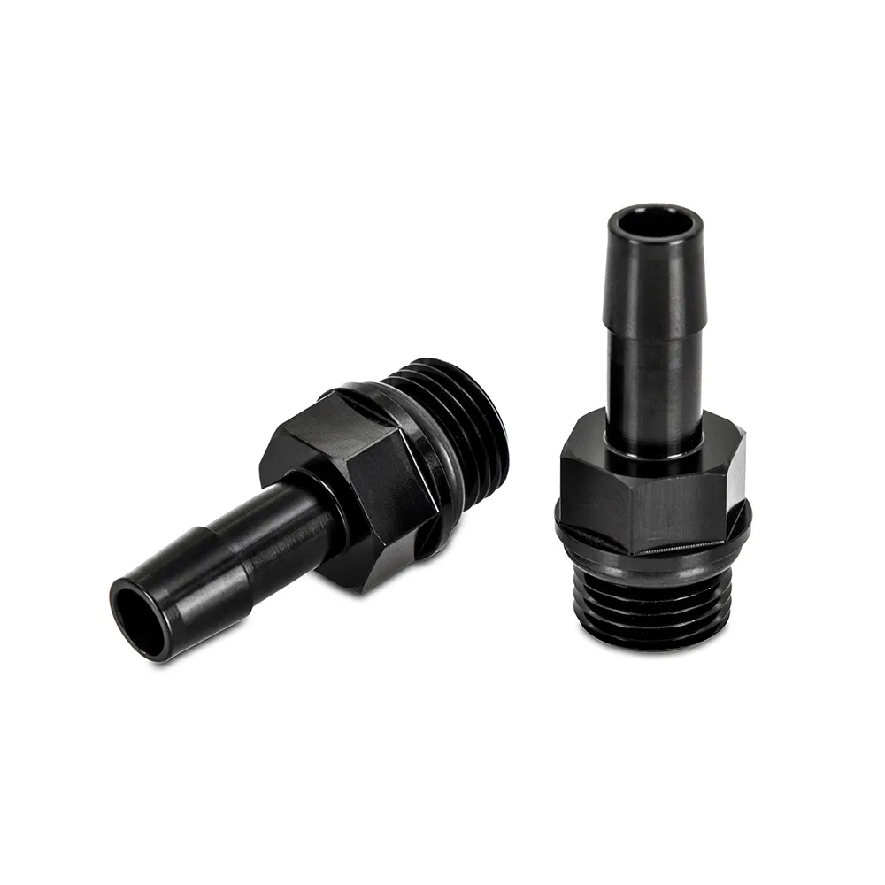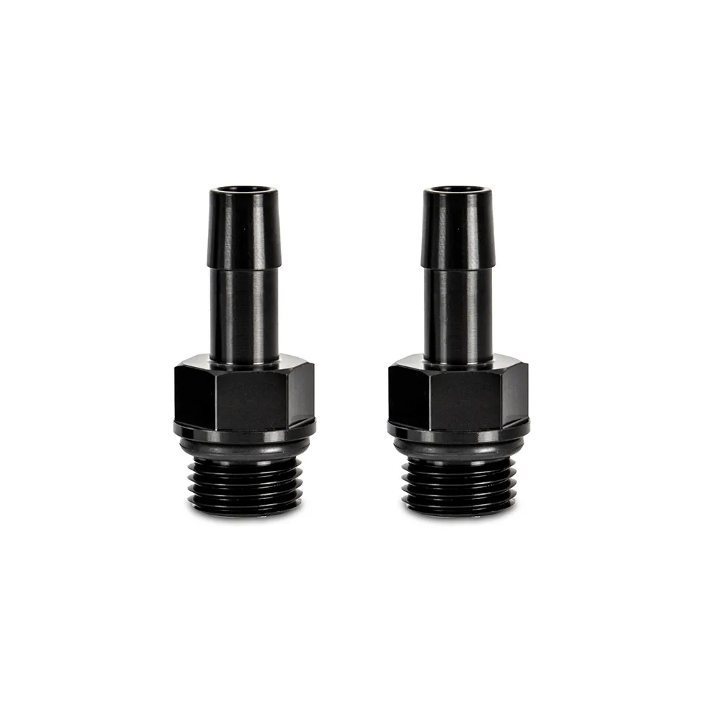 These fittings adapt a M16x1.5 thread to a 3/8" push-on hose barb. They are made from 6061 aluminum and feature a black anodized finish for superior durability. The threaded end is sealed with a Viton O-Ring.