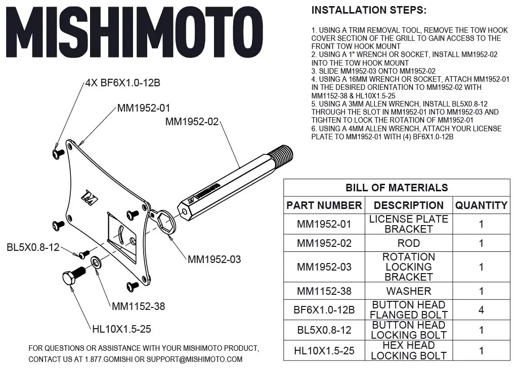 Designed specifically for the 2023+ Nissan Z, our license plate relocation kit is constructed from high-strength, anodized and powder coated 6061-aluminum. It mounts directly to the OEM tow hook location, allowing for a clean and seamless installation. Angling and relocating the plate to the side not only helps reduce wind resistance, but it also frees up grille space, facilitating critical airflow to your radiator and letting your Z breathe easy. And let's be honest, it just looks better! The days of ugly holes in your bumper are no more. Our license plate relocation kit includes all necessary hardware for an easy installation, and as with all our products, this kit includes our signature Mishimoto Lifetime Warranty.