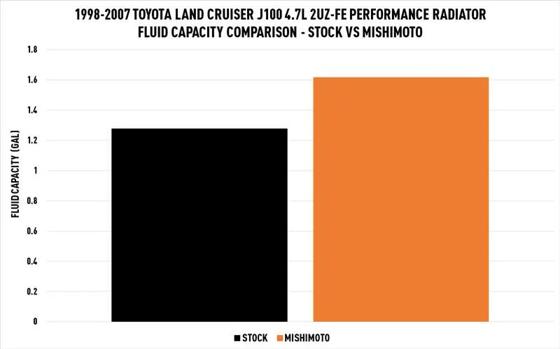 The Mishimoto 1998-2007 Toyota Land Cruiser J100 Performance Aluminum Radiator is an ideal upgrade for the brittle stock radiator. Our radiator boasts a 19% greater core volume and 26.5% greater coolant capacity to improve cooling efficiency. The Mishimoto Toyota Land Cruiser J100 radiator features durable, aircraft-quality, aluminum end tanks that are precision TIG-welded to the 56mm-thick core for superior durability.