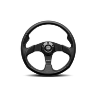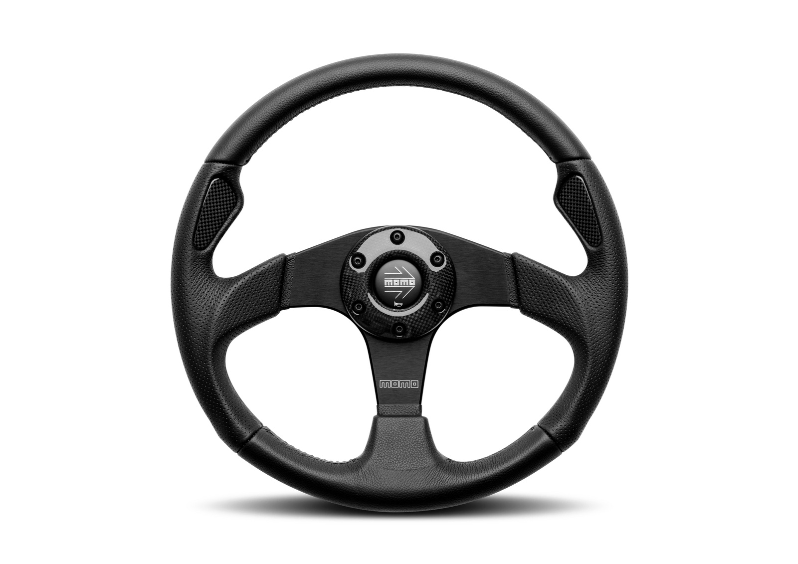 Top grain black leather with airleather grip and carbon inserts. Black spokes, carbon ring and black horn button. Black stitches. 320mm Version Dish: 46mm 350mm version Dish: 42mm