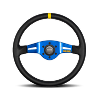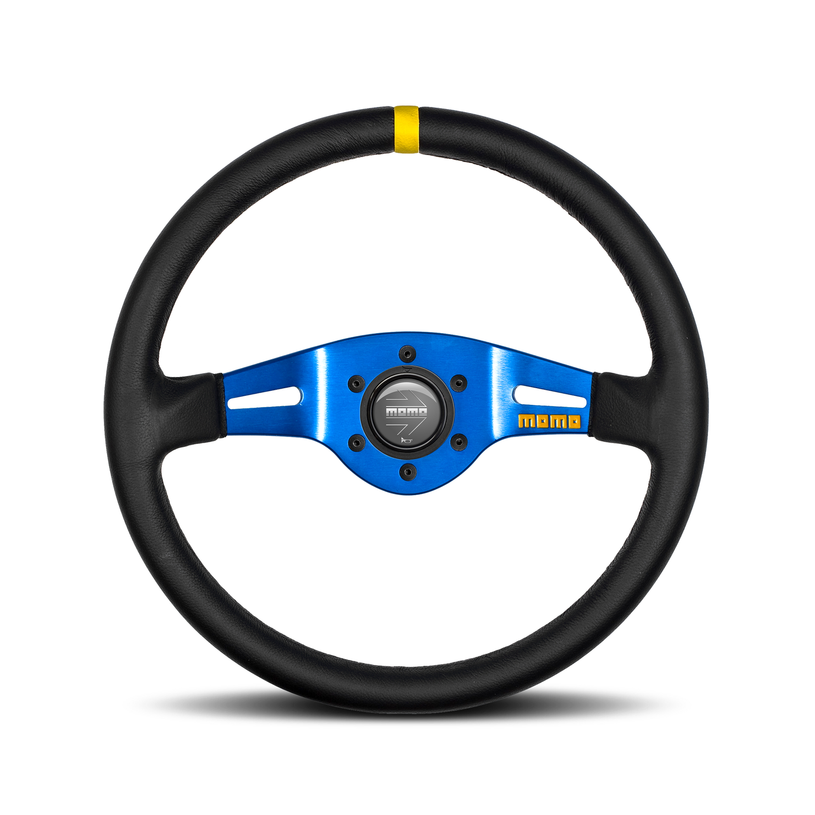 Diameter: 350mm Round grip Dish : 70mm Compatible with MOMO Hub Includes MOMO horn button kit Black or blue spokes Leather or suede