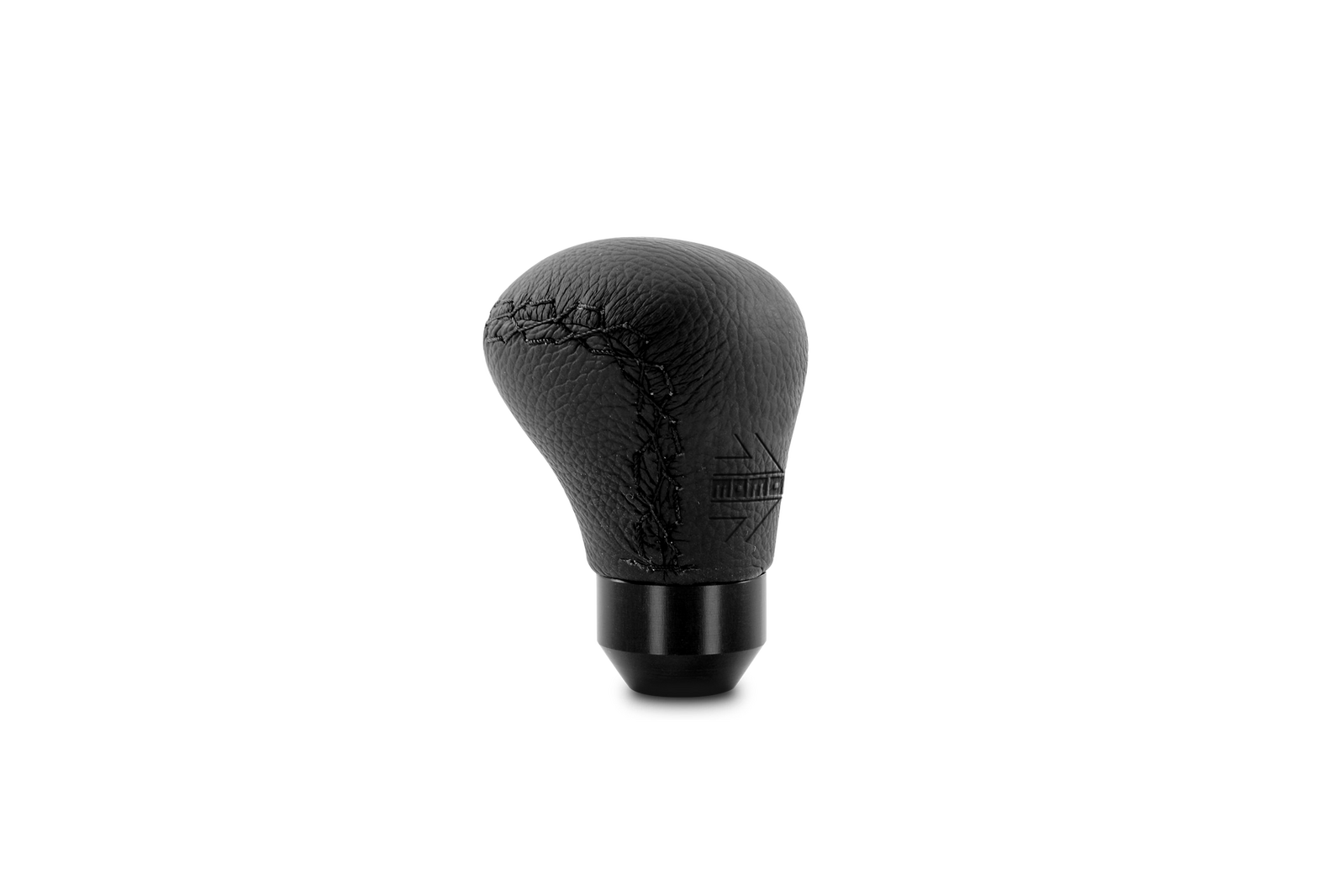 Anatomically shaped shift knob in top grain black leather. Black stitch and black collar. Embossed Momo logo.