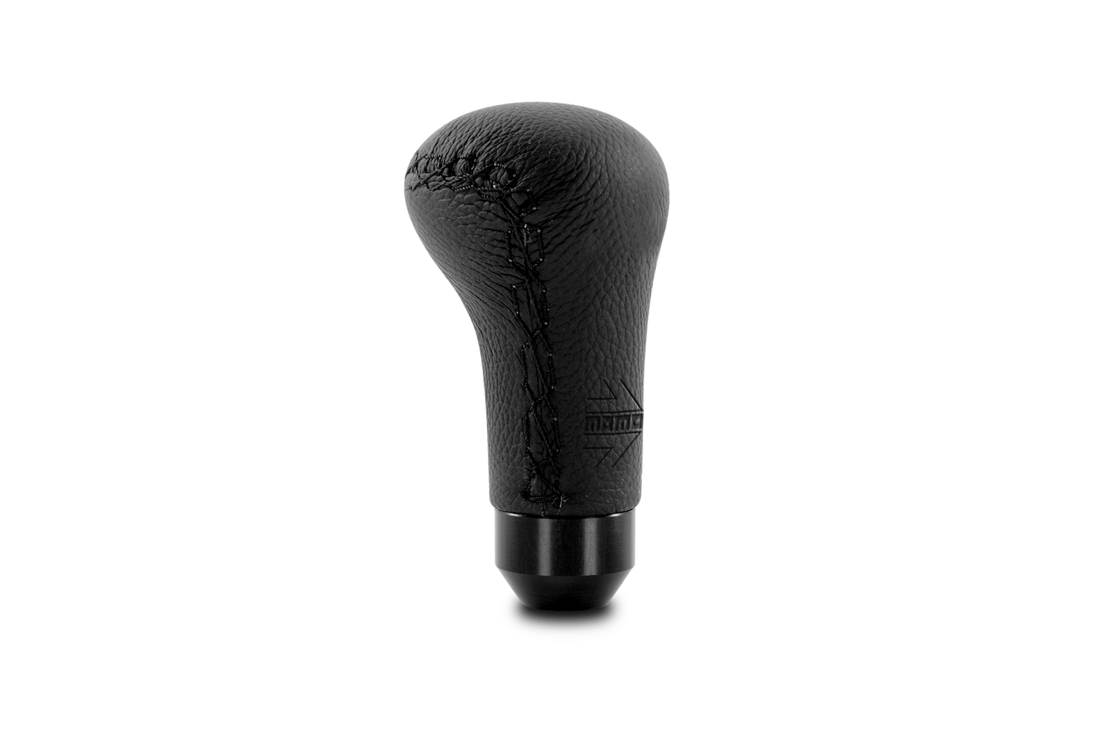Anatomically shaped shift knob in top grain black leather. Black stitch and black collar. Embossed Momo logo.