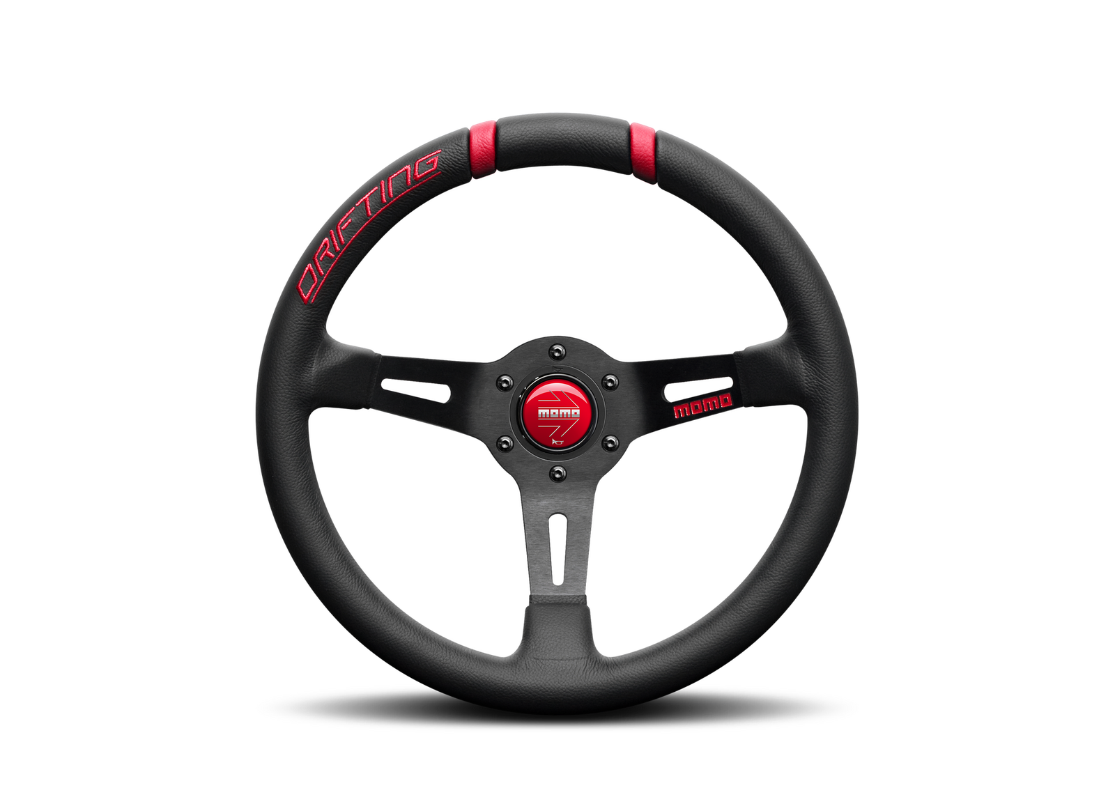 Orange version Diameter 350 mm, 90 mm dish, black leather, orange spokes. Orange leather inserts. Embroidered drifting logo. Yellow version Diameter 350 mm, 90 mm dish, black leather, anthracite spokes. Yellow leather inserts. Embroidered drifting logo. Red version Diameter 330 mm. 88 mm dish. Black leather, black spokes, red horn button. Red leather inserts. Embroidered drifting logo. Blue version Diameter 330 mm. 88 mm dish. Black leather, black spokes, blue horn button. Blue leather inserts. Embroidered drifting logo.