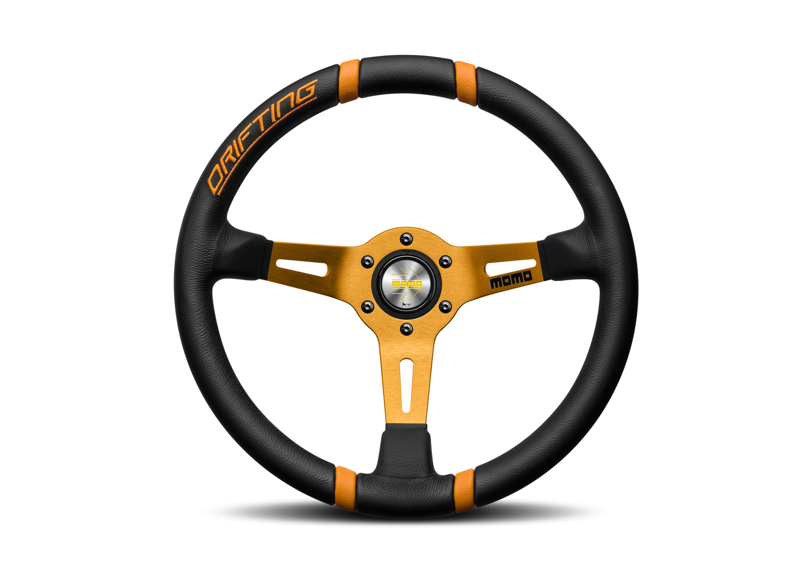 Orange version Diameter 350 mm, 90 mm dish, black leather, orange spokes. Orange leather inserts. Embroidered drifting logo. Yellow version Diameter 350 mm, 90 mm dish, black leather, anthracite spokes. Yellow leather inserts. Embroidered drifting logo. Red version Diameter 330 mm. 88 mm dish. Black leather, black spokes, red horn button. Red leather inserts. Embroidered drifting logo. Blue version Diameter 330 mm. 88 mm dish. Black leather, black spokes, blue horn button. Blue leather inserts. Embroidered drifting logo.