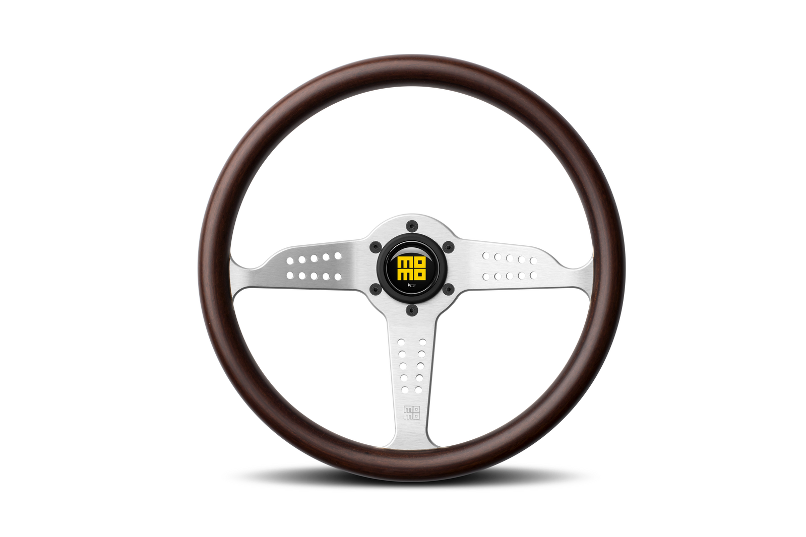 Diameter 350 mm – grip 27 x 26 mm – dish 37 mm. Mahogany wood walnut matt finishing with back finger grooves. Chrome finish spoke.