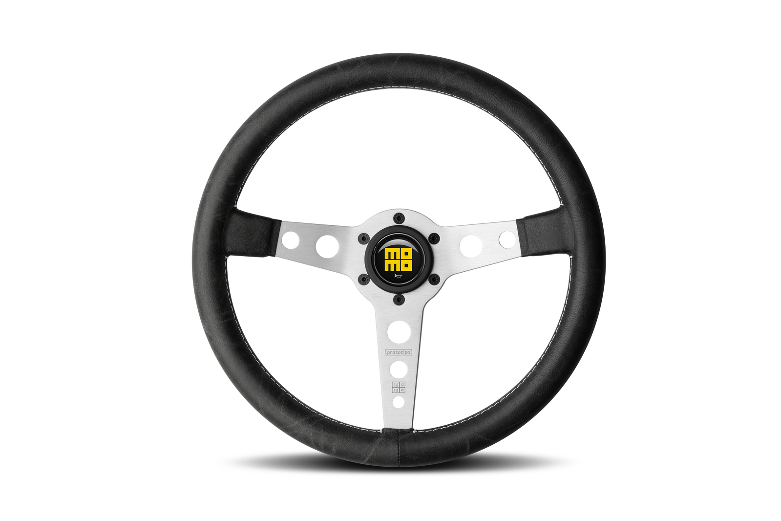 Diameter 350 mm – grip 30 x 29 mm – dish 39 mm Distressed black leather White stitches Silver spoke
