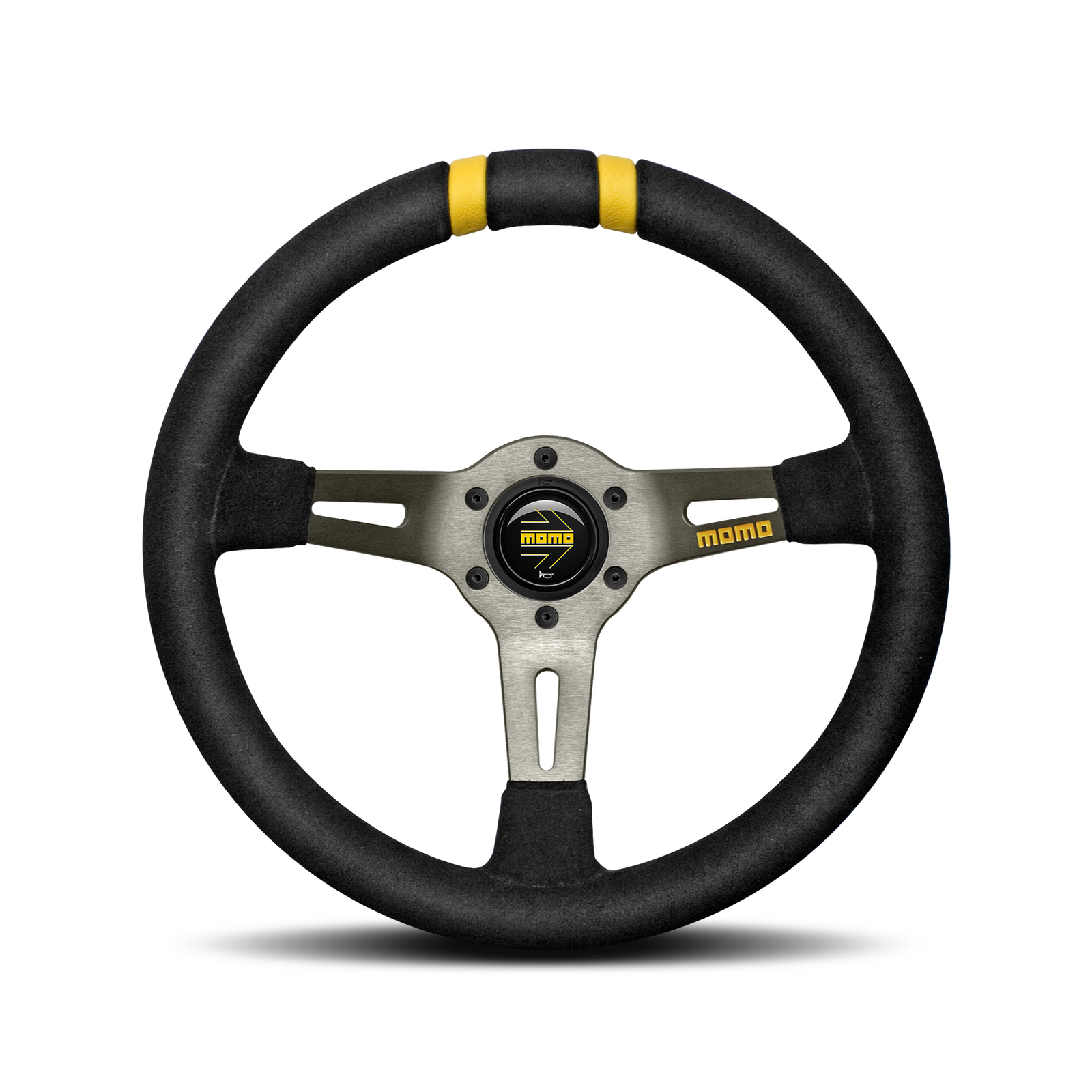 Orange version Diameter 350 mm, 90 mm dish, black leather, orange spokes. Orange leather inserts. Embroidered drifting logo. Yellow version Diameter 350 mm, 90 mm dish, black leather, anthracite spokes. Yellow leather inserts. Embroidered drifting logo. Red version Diameter 330 mm. 88 mm dish. Black leather, black spokes, red horn button. Red leather inserts. Embroidered drifting logo. Blue version Diameter 330 mm. 88 mm dish. Black leather, black spokes, blue horn button. Blue leather inserts. Embroidered drifting logo.