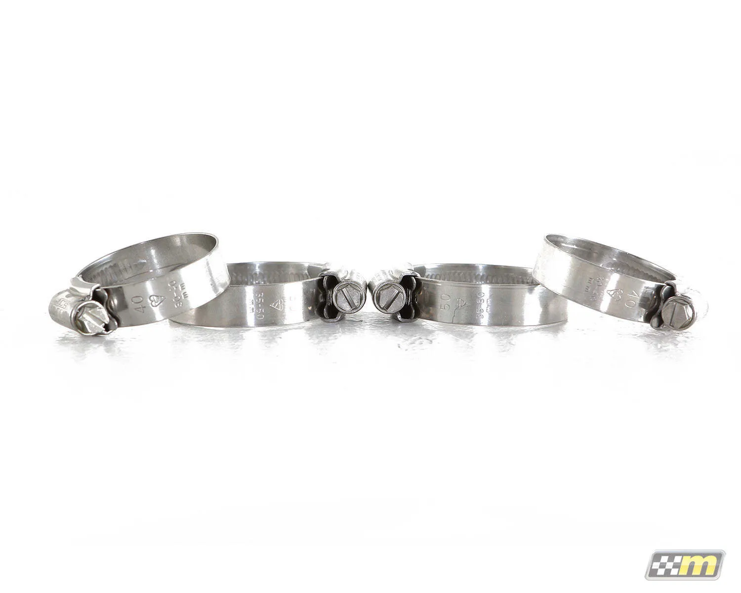 mountune's hose clip kits have been engineered for soft durometer hoses such as silicone, and unlike typical T-bolt clamps that may cause deformation and hose damage, mountune's hose clip kits feature a protective liner to increase clamp load without damaging the hose.