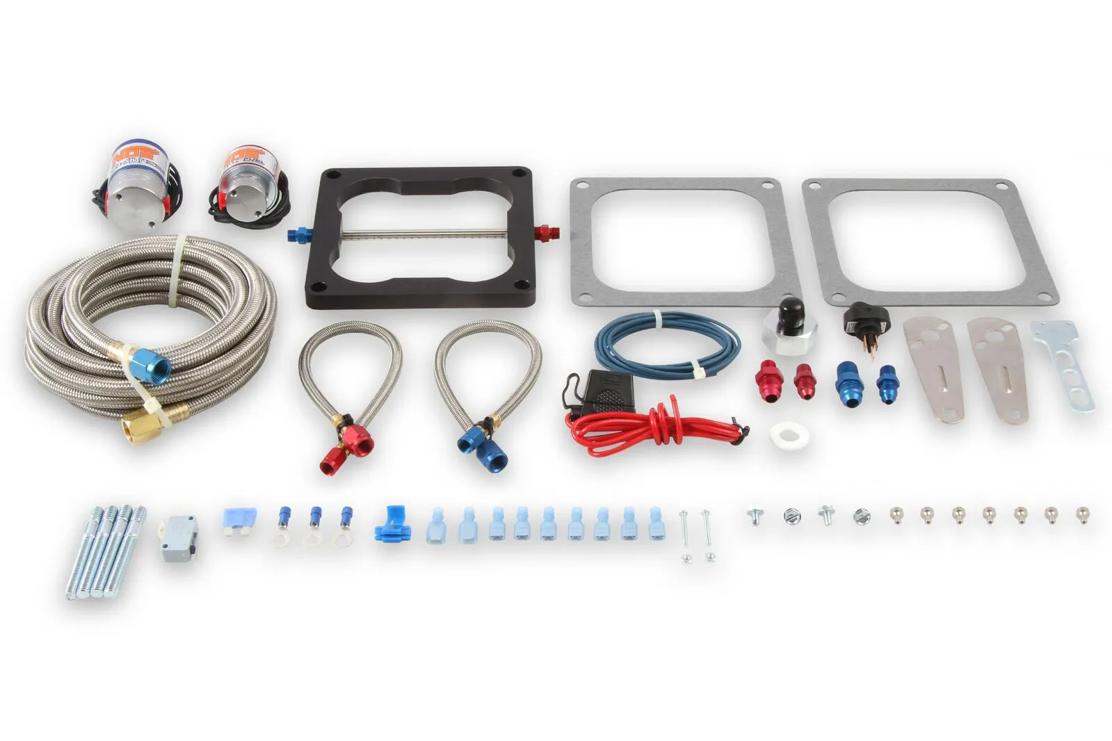 Two Cheater™ solenoids control the first stage while a Super Pro Shot nitrous solenoid and a high-output Cheater fuel solenoid control the second stage. A 10 lb. nitrous bottle is standard. Optionally available are a wide variety of NOS electronic controllers. These can be employed, for example, to activate the second stage, while a NOS Progressive Nitrous Controller can be used to actually dictate the amount of nitrous (in percentages of total power potential) and the timing. Actual performance gains will vary depending on the engine's condition, configuration and jetting of nitrous system. Optional power jets are available for a variety of horsepower settings.