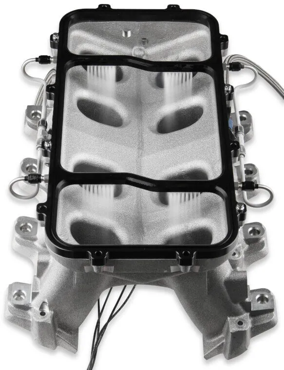 • This dry single stage plate system sandwiches between the bottom base and top plate on Holley Hi-Ram intake manifolds