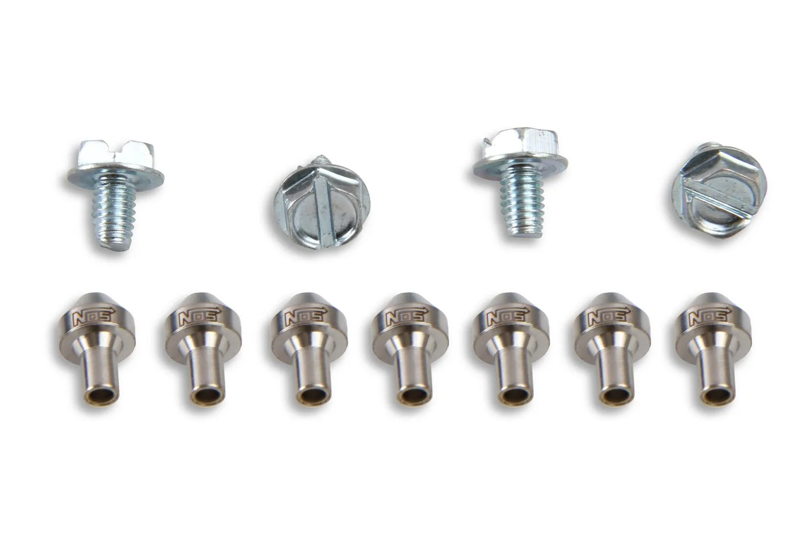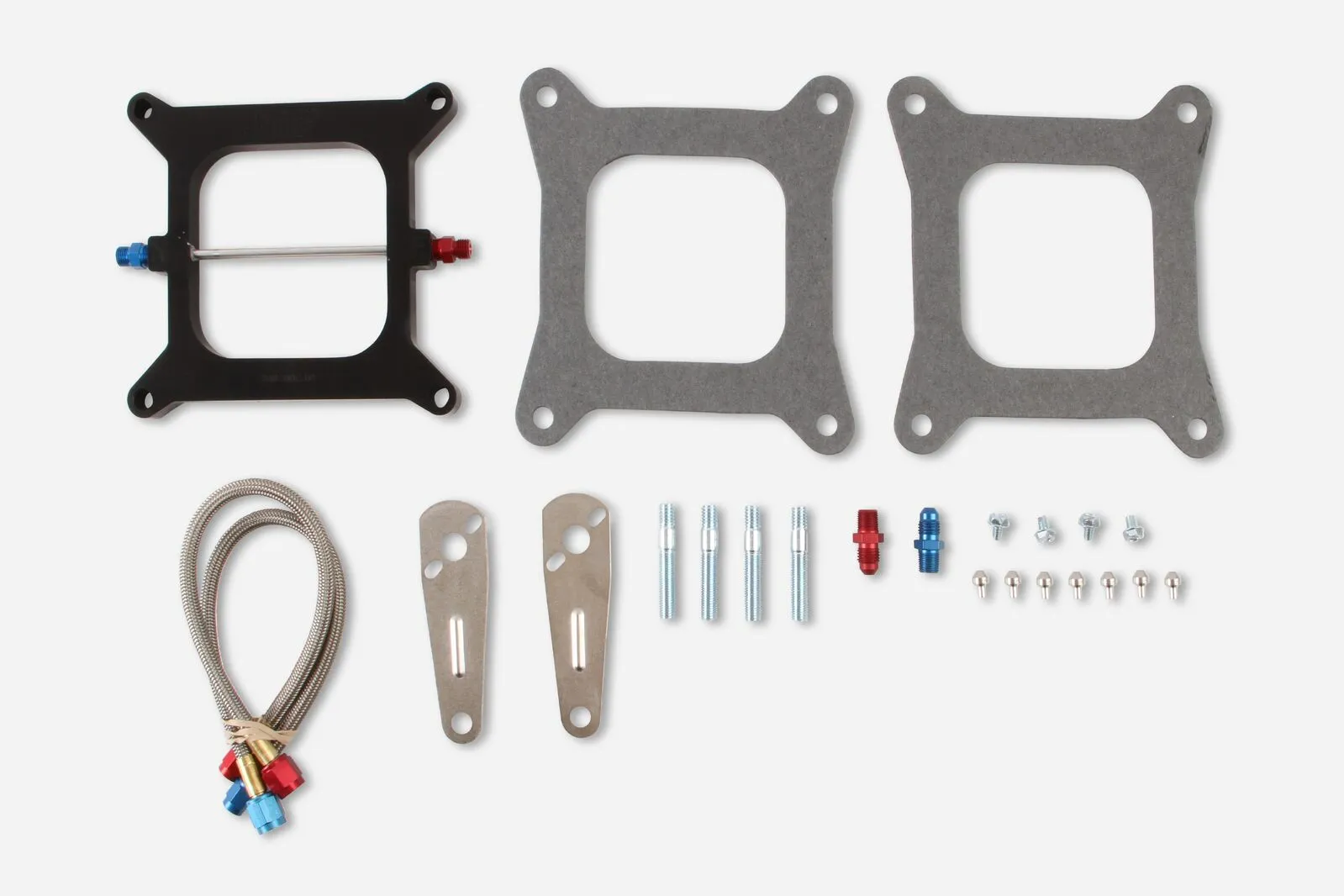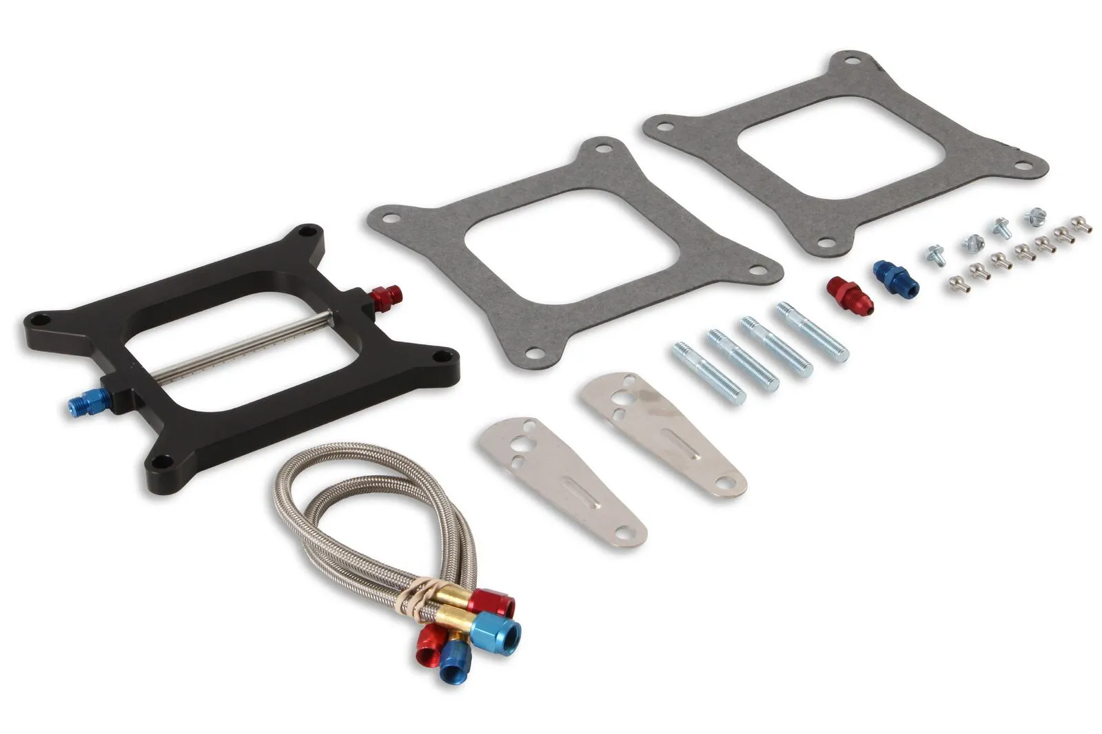 Big Shot Injector Plate, w/Jets & Plumbing, Holley Square Bore, V8 - Assure a steady, precise metered flow of nitrous and fuel for reliability. Backed with years of laboratory research, as well as dyno and drag strip testing. NOS Injector Plates are available for those who want to build their own system or upgrade their current nitrous system without having to go through the expense of a new complete system. Unless specified, NOS Injector plates incorporate a low profile (1/2" thick) design and are constructed of solid billet or die cast aluminum with a durable black finish. Included are all applicable gaskets, studs, jets and plumbing.