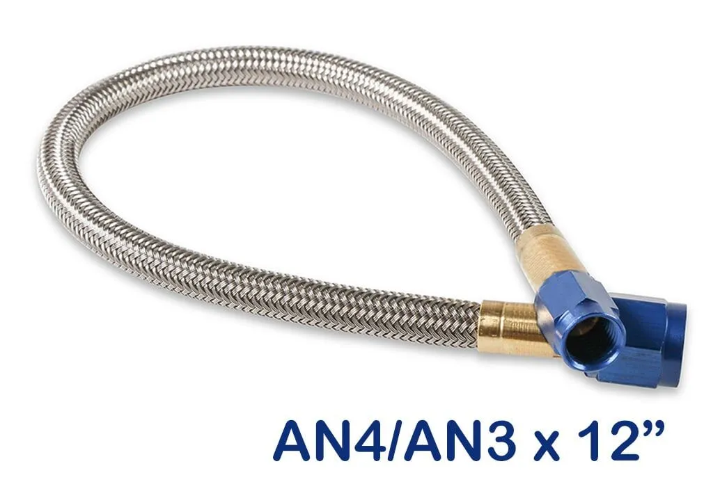 NOS premium grade stainless steel braided hoses come with -3, -4, -6 and -8 AN fittings (including step-ups) in virtually any length. They are all PTFE lined to withstand high pressures and provide high flow with a stainless steel outer covering for strength and resistance to abrasion. All NOS lines are configured for a superior flow to strength ratio. The AN fittings are color coded for identification: blue (for nitrous) or red (for fuel).