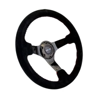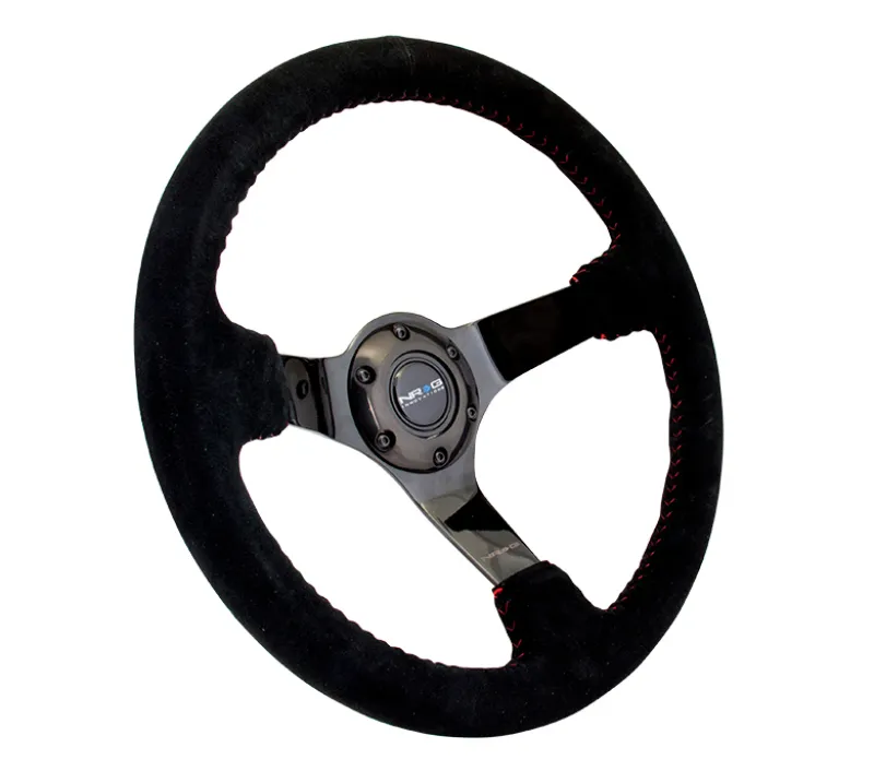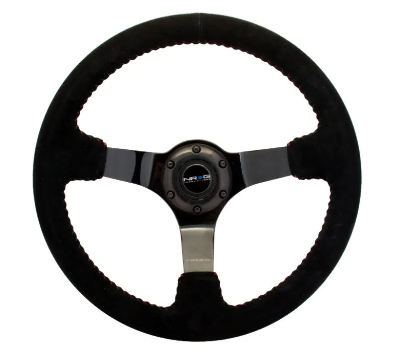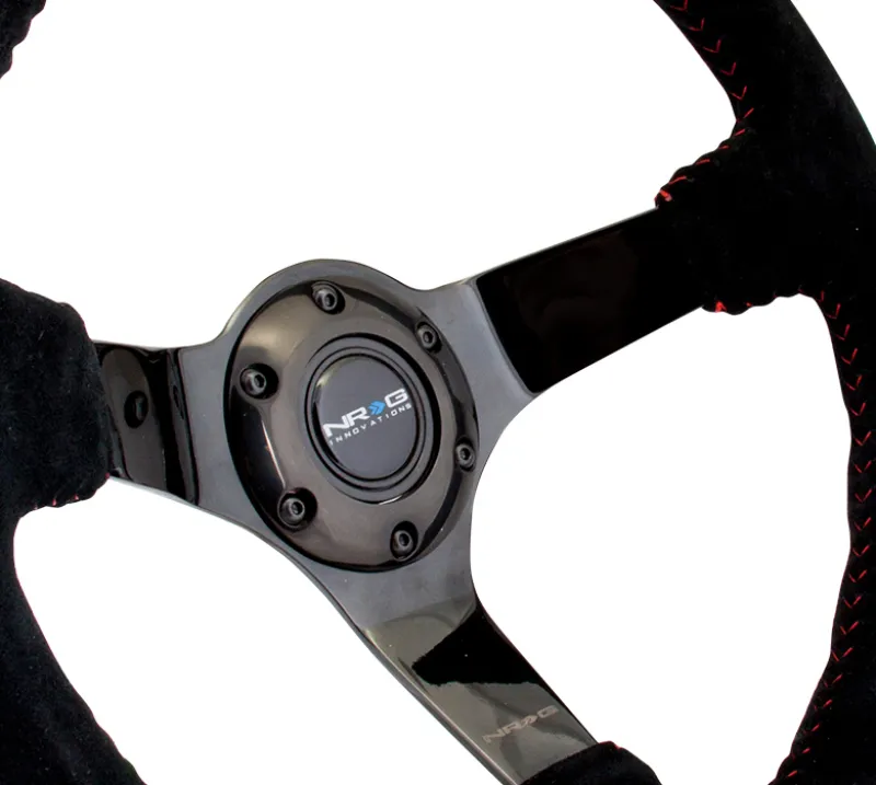 NRG Reinforced Steering Wheel (350mm / 3in. Deep) Blk Suede w/Red BBall Stitch & Black 3-Spoke