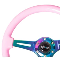 NRG Classic Wood Grain Steering Wheel (350mm) Solid Pink Painted Grip w/Neochrome 3-Spoke Center