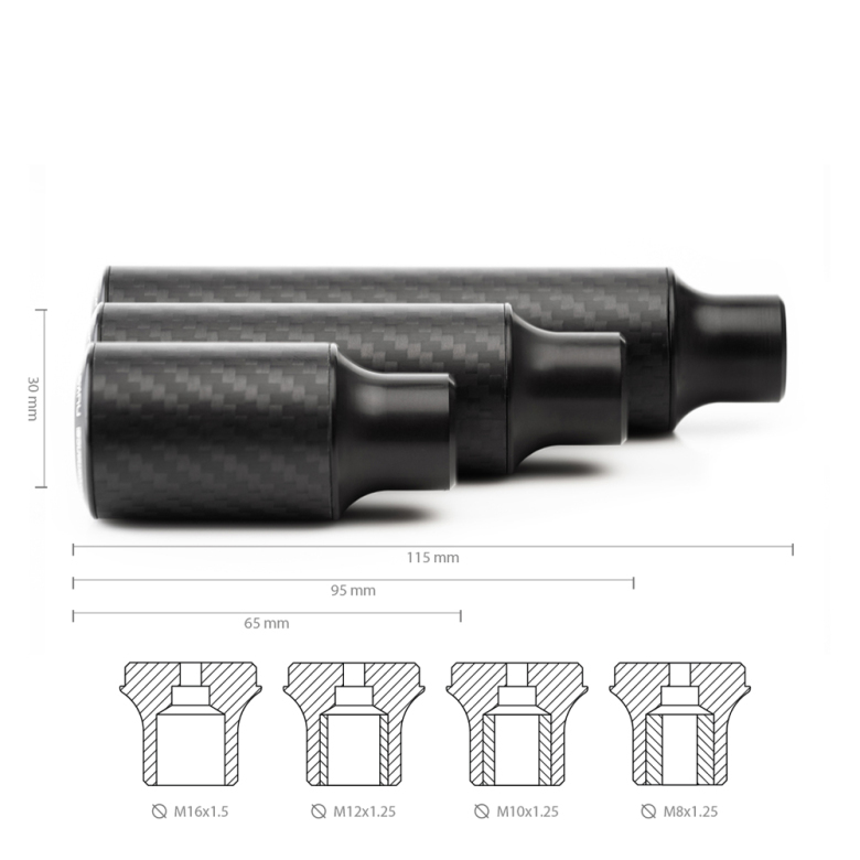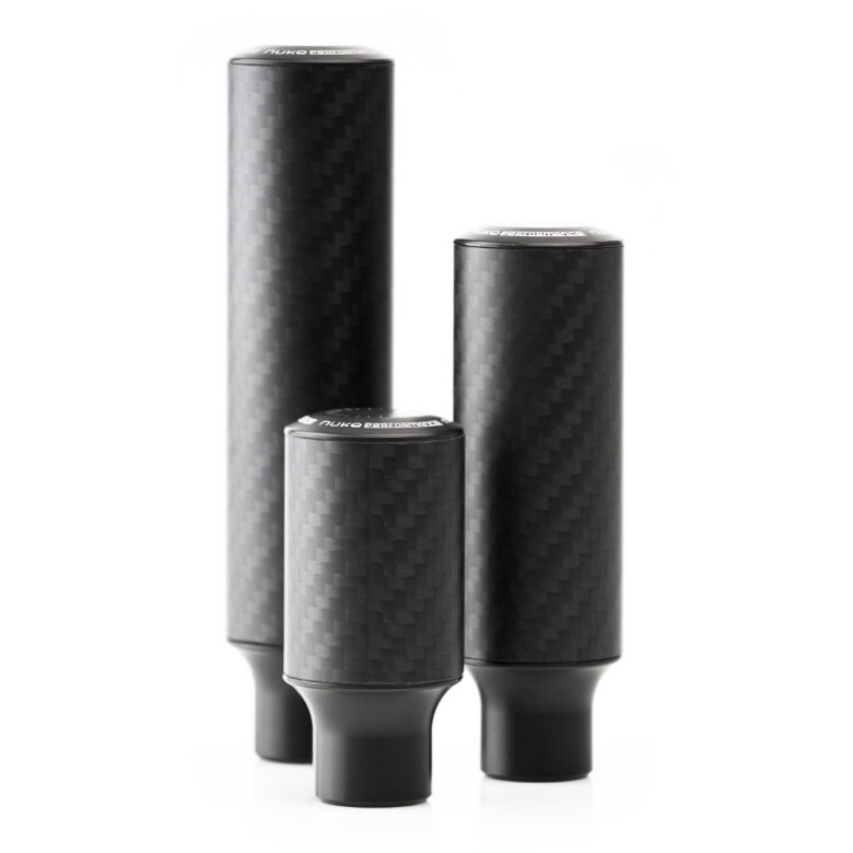 The Nuke Performance universal Gear Knobs, Cavernous Carbon, comes in three lengths and two finishes. All three lengths and both finishes are made of real high-quality carbon and billet and anodized aluminum.