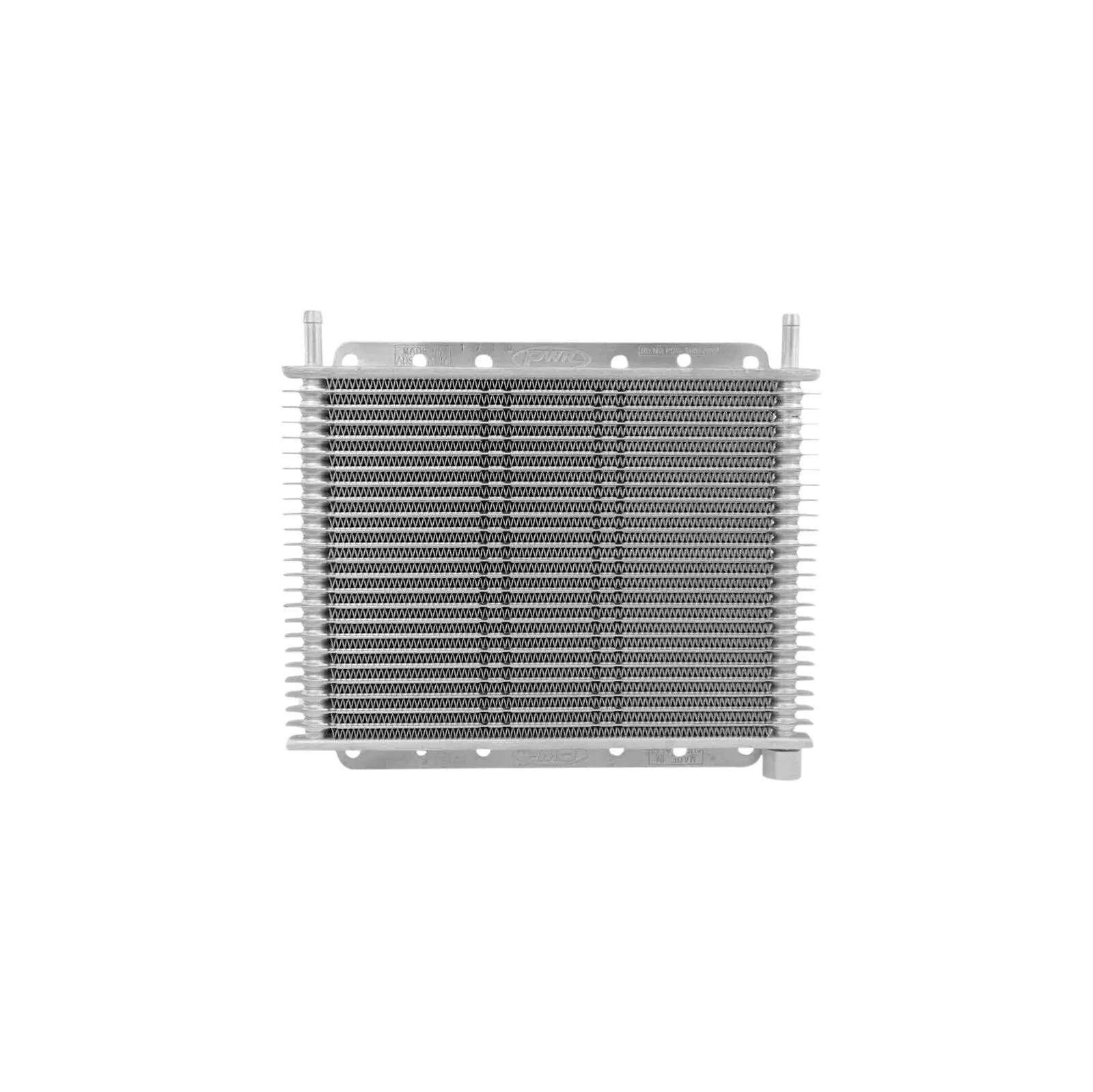 PWR’s patented plate and fin transmission oil coolers are made from 100% aluminium construction which allows the cooler to be made strong, lightweight and compact while offering high heat transfer and corrosion resistance. The plate design turbulates the oil flow and in conjunction with the unique louvered fin design provides highly efficient cooling with low-pressure drop. Manufactured with a 19mm core, these coolers are perfect for automatic transmissions, power steering and differential cooling for race and road applications. Offered with 5/16?, 3/8” or 1/2" push-on hose barbs or Dash -6 AN male threaded fittings. 5/16” and 3/8” can be ordered in kits containing hose, hose clamps and mounting hardware. Custom fittings for specific applications such as thermo switch bosses for thermo fan operation can be special ordered.
