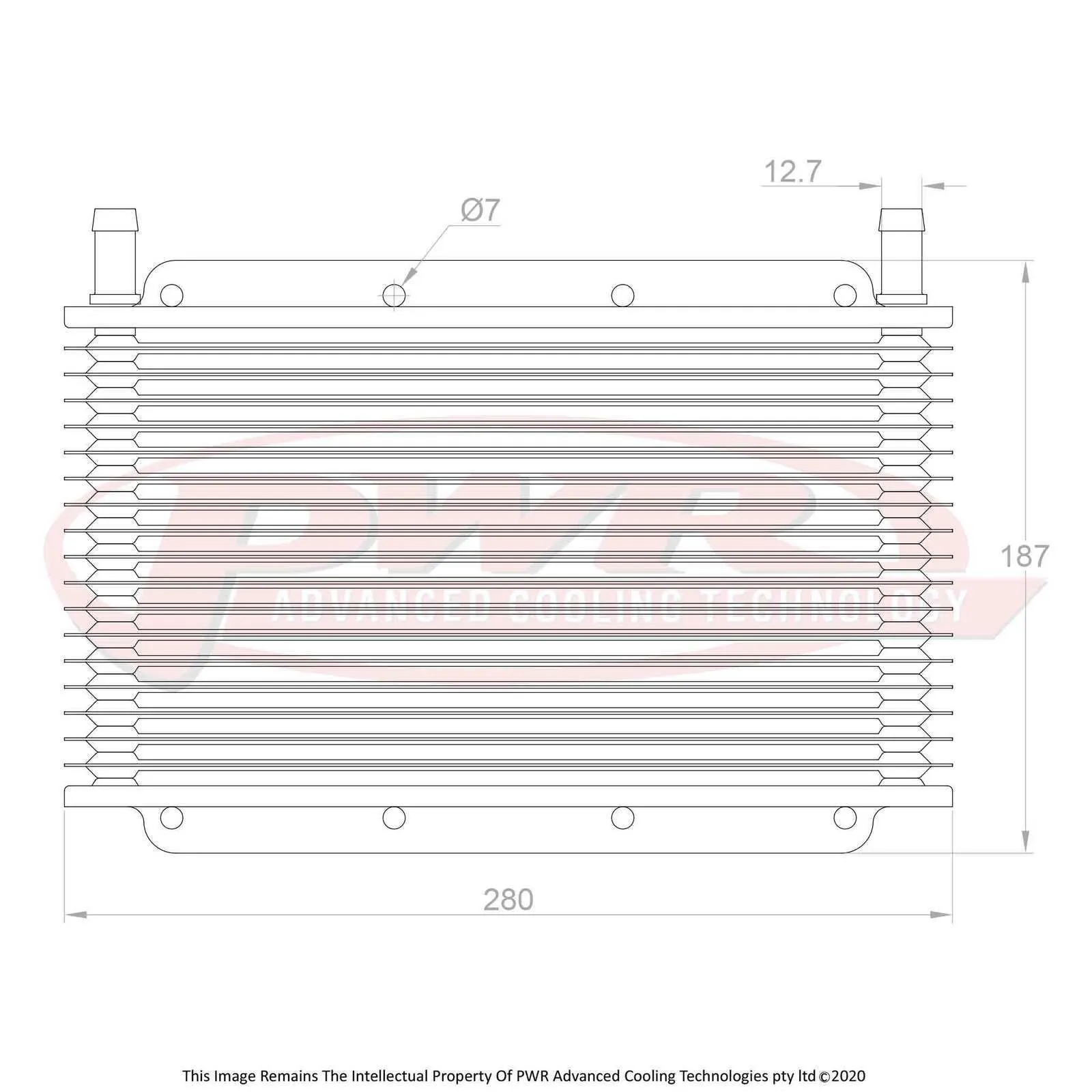 PWR’s patented plate and fin transmission oil coolers are made from 100% aluminium construction which allows the cooler to be made strong, lightweight and compact while offering high heat transfer and corrosion resistance. The plate design turbulates the oil flow and in conjunction with the unique louvered fin design provides highly efficient cooling with low-pressure drop. Manufactured with a 19mm core, these coolers are perfect for automatic transmissions, power steering and differential cooling for race and road applications. Offered with 5/16?, 3/8” or 1/2" push-on hose barbs or Dash -6 AN male threaded fittings. 5/16” and 3/8” can be ordered in kits containing hose, hose clamps and mounting hardware. Custom fittings for specific applications such as thermo switch bosses for thermo fan operation can be special ordered.