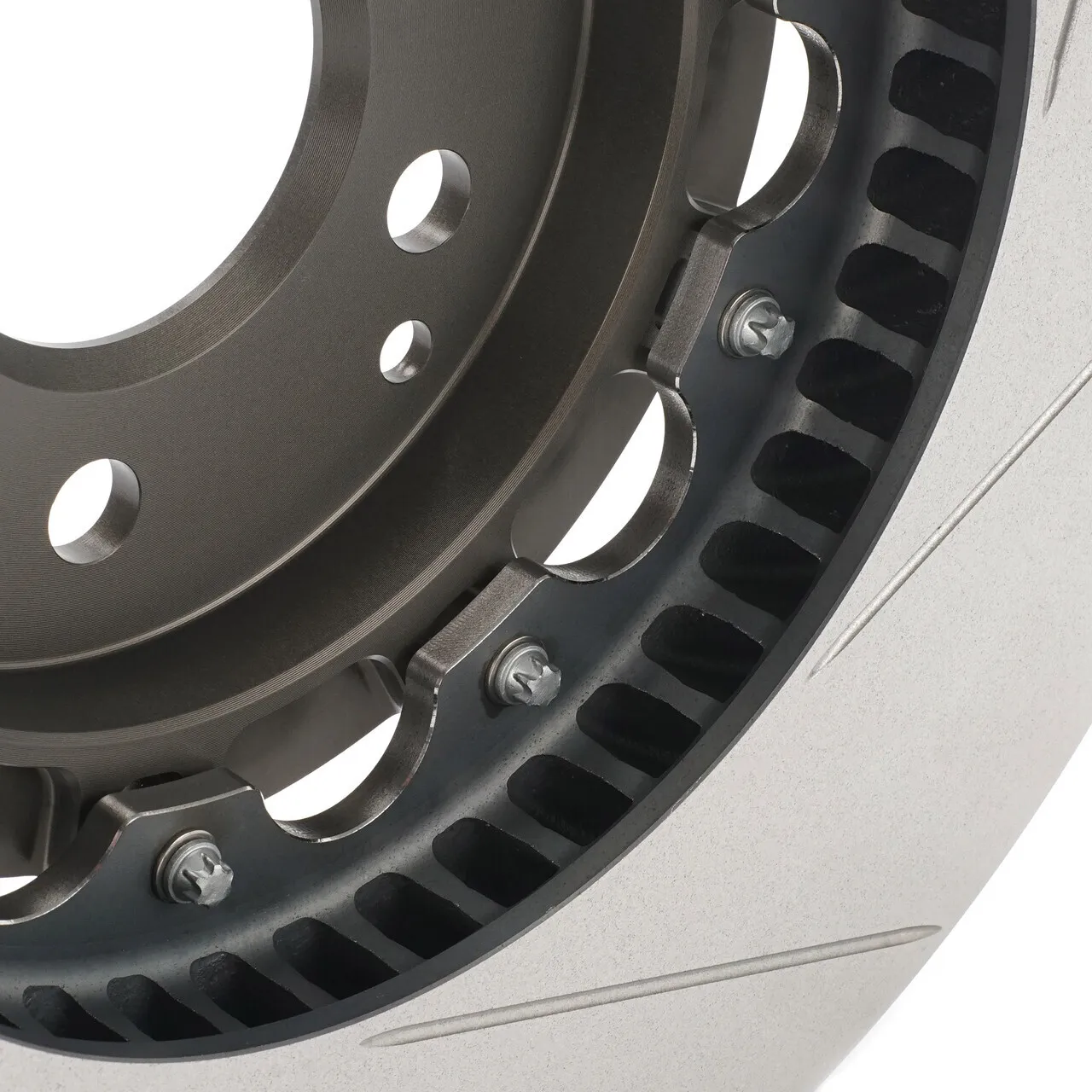 Paragon Performance 2-piece Rotor offers superior braking and cooling efficiency optimized for track and race applications. It features directional ventilation vanes to create suction, turbulence, and guides cool air through the rotor for improved heat dissipation and increased resistance to cracking under harsh track condition.