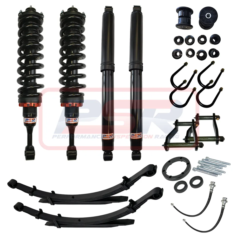 This system sits at 3" front and 2" rear and includes our PSR TTG 2 - 5" height adjustable struts all pre-assembled with Kings Coil Springs, PSR TTG Long Travel Rear Shocks, 2" leaf springs, PSR tailshaft spacer, extended brake lines, leaf spring bushes, greasable shackles and U-bolts.
