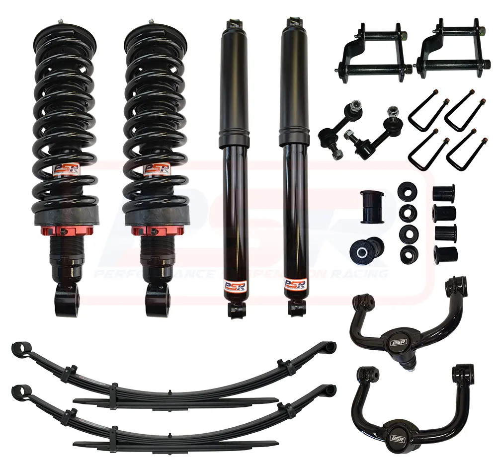 This system sits at 3" front and 2" rear to sit the car level and contains our custom height adjustable PSR TTG front struts fully assembled with Kings coil springs and PSR HD top mounts, PSR upper control arms, HD front sway bar link pins, 150kg constant load 2" leaf springs, greasable shackles, bushes, U-bolts and PSR TTG rear shocks.
