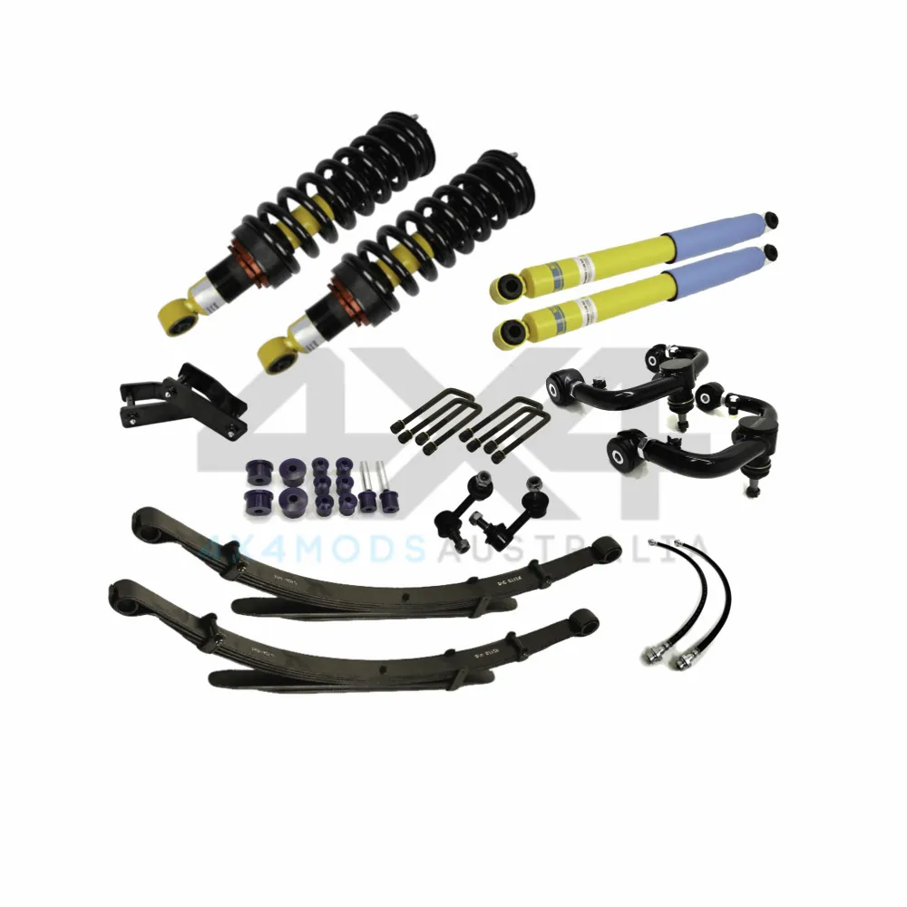 This system sits at 4" front and 3" rear to sit the car level and contains our custom height adjustable Bilstein front struts fully assembled with Kings coil springs and PSR HD top mounts, PSR adjustable upper control arms, HD front sway bar link pins, EFS 150kg constant load 2" leaf springs, extended shackles, bushes, U-bolts, extended rear brake hoses and Bilstein rear shocks. We also recommend fitting either our Standard (PSRNAV-021) or Deluxe (PSRNAV-016) Diff Drop to correct CV angle.
