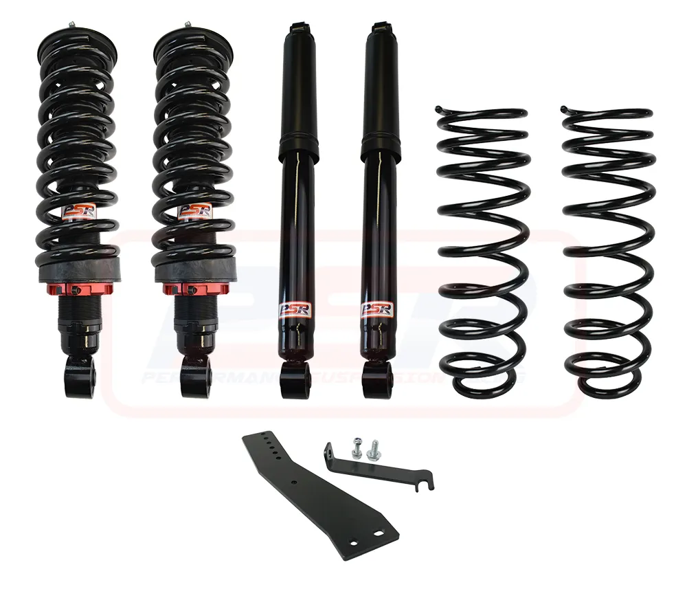 This kit contains PSR TTG front struts all pre-assembled with Kings coil springs and HD strut tops, King Springs 2" rear coils, PSR TTG rear shocks and headlight aim bracket.