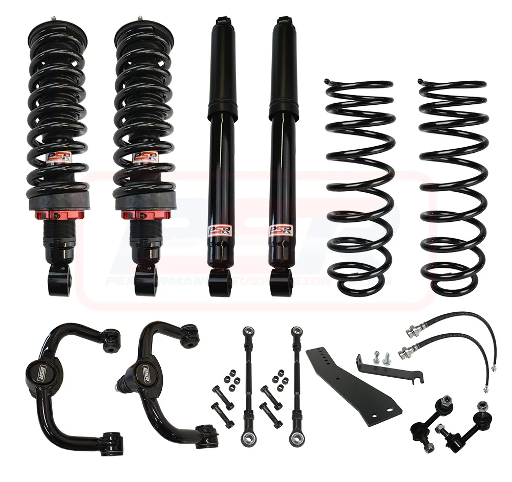 This system sits at 3" front and 2" rear and contains our custom height adjustable PSR TTG front struts fully assembled with Kings coil springs and PSR HD top mounts, PSR upper control arms, HD front sway bar link pins, PSR 2" rear flex coils, PSR TTG rear shocks and headlight aim bracket.