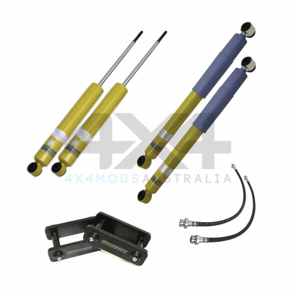 This system sits at 2" front & 1" rear and contains Bilstein front and rear shocks, PSR extended shackles, brake hose and optional torsion bars.