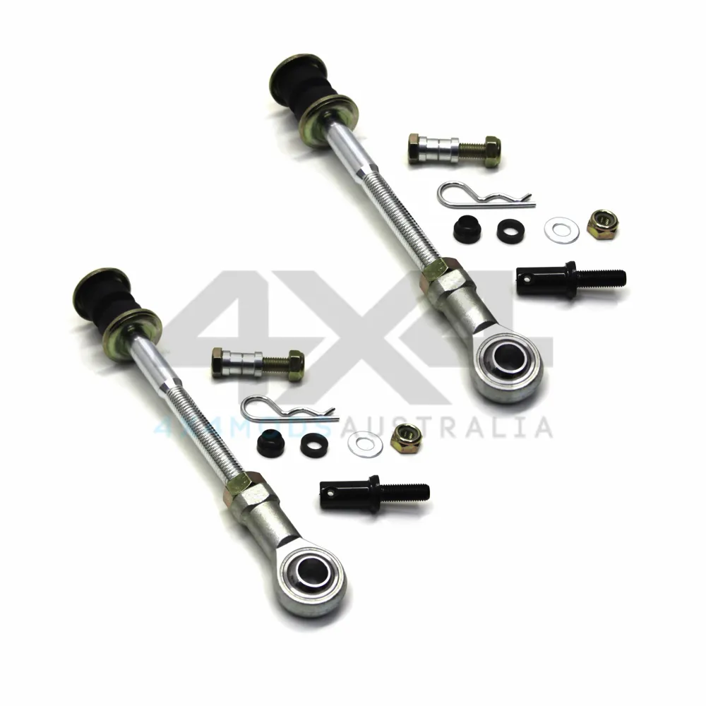 This kit contains 2x rear adjustable swaybar link/disconnects to suit all GQ coil rear wagon & ute variations running 6"+ Lift or Super Long Travel Suspension. Sway bar disconnects are designed to allow sway bars to work as intended while on road and then disconnect to allow free suspension movement without restriction from the sway bar when off road. Supplied with bolts to use as a fixed extended sway bar link pin.