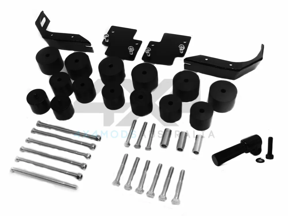 PSR offers a complete bolt-in 2" Body Lift Kit for a single or extra cab variation with a tub. Kit is supplied with high tensile bolts and blocks to the size or larger than OE body mounts to be compliant. Kit comes with a bolt in steering column extension. Also supplied is a reo bar lift bracket to allow the factory reo to be retained if plastic bumper is still fitted to vehicle. Spacers are supplied to couple the factory splash guard if retained. An auto line bracket is supplied for auto models so cooler line will not rub on the sway bar. Kit is complete with no additional items to purchase to Body Lift your Isuzu DMAX 2". Suits DMAX1 and DMAX2. Extra / Single Cab (WITH TUB). Blocks are machined from 6061 T6 Alloy block and anodized black.