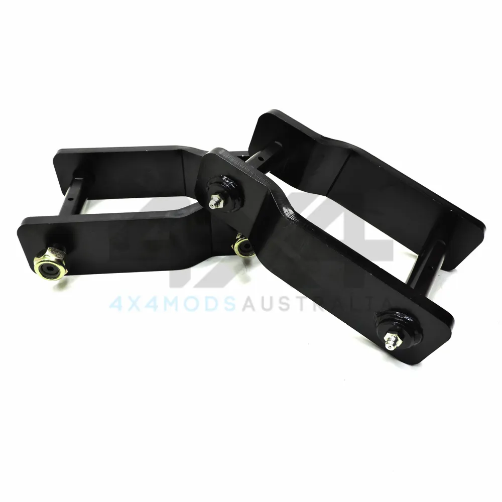 PSR's extended shackle for the Holden Colorado & Isuzu D-MAX models is a super heavy duty leaf spring shackle. Designed to a length that provides 1" of lift, it features side plates made from 10mm laser cut steel, CNC machined and welded pins. Pins are greaseable for a long service life. This shackle was designed due to its ability to give 1" lift and free up leaf spring movement. The factory shackle is only 85mm on and severely restricts leaf movement. Couple this shackle to a 2" lift leaf to gain a 3" lift to complement a front end that only allows for a 3-3.5" lift. Coated Black to blend with the chassis.