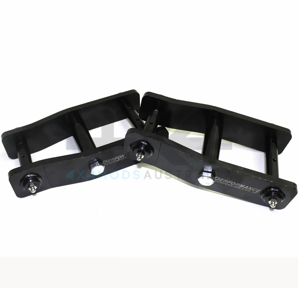 PSR's STEPPED extended shackle for the Toyota Hilux IFS torsion bar models is a super heavy duty leaf spring shackle. Designed to a length that provides 2" of lift it features side plates made from 10mm laser cut steel, CNC machined and welded pins. Pins are greaseable for a long service life. Welded design is far superior to other designs on the market as it reduces shackle walking and flexing under load. Others are designed around a centre welded support with no outer support where it is needed. Coated Black to blend with the chassis.