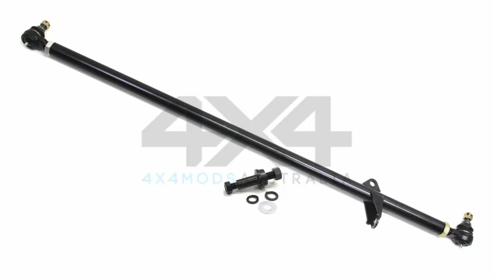 PSR's Nissan Patrol GQ replacement drag link is a heavy duty adjustable option to replace the factory non-adjustable unit. This drag link is made from 32mm 4140 chromoly with a 5.5mm wall thickness to increase strength. Supplied with greaseable, replaceable heavy duty tie rod ends in a 22mm male design for increased strength. Drag link has both styles of damper brackets welded in place to suit both style steering dampers. Bar is CNC machined and undergoes multiple treatments for corrosion treatment to increase longevity. Bar supplied in a coated Black finish to blend into the chassis.