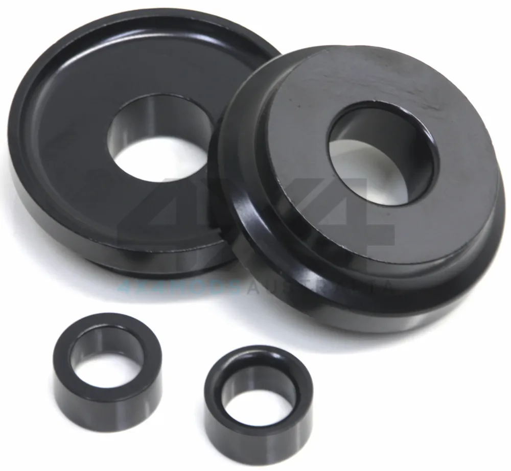 PSR's radius arm spacer is designed to push the entire diff assembly forward for more tyre clearance at the guard. This Kit replaces the factory washes which can bend under extreme articulation. This complete Kit is machined from high tensile steel and protected for a on service life.