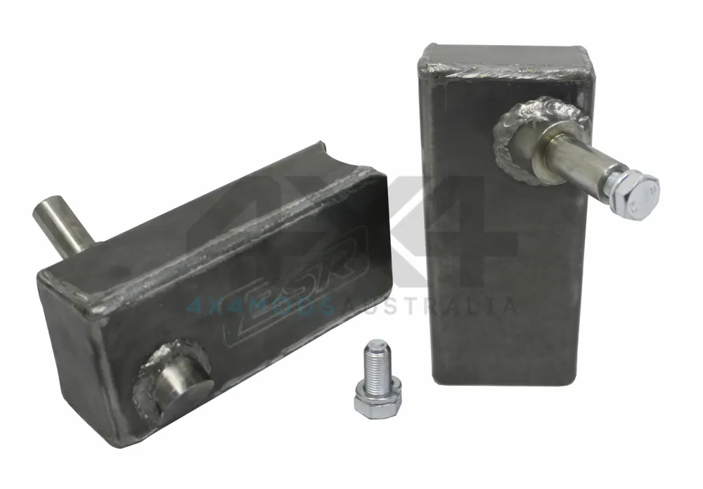 A common catch point to the underside of your vehicle is the lower shock mount, to remove this issue a high clearance shock mount is offered. This mount is a weld on HD mount and lifts the shock point up 100mm. Mount comes pre welded and features a CNC machined pin that has an internal thread rather than the factory exposed style pin, this means if the head of the bolt was ever to get damaged the rest of the bolt can be removed, whereas if the stud was to break the entire unit would more than likely need to be repaired / refabricated.