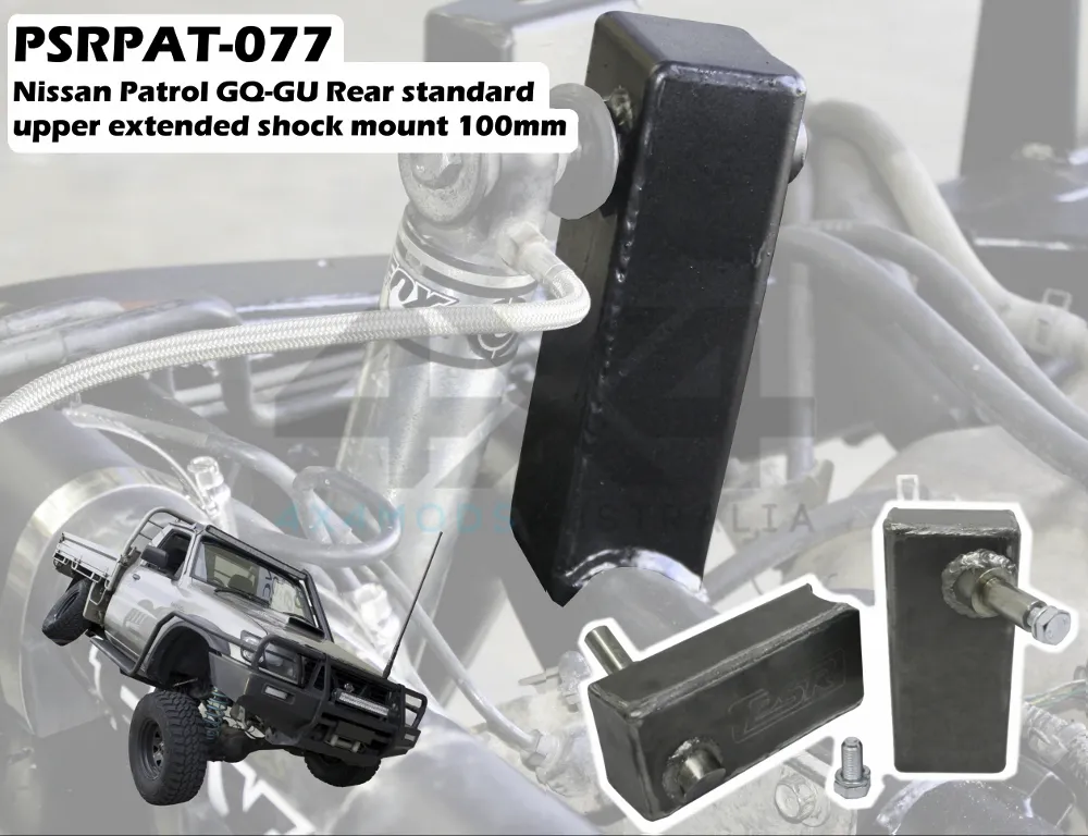 PSR's Nissan Patrol GQ-GU Rear Extended Shock Mounts are a weld on mount that replaces the factory location on the diff. This is an area which can greatly improve the rear suspension through modified mounting heights to suit different shock lengths, achieving desired travel of your rear suspension. Depending on requirements both the diff and the chassis mounts can be modified.