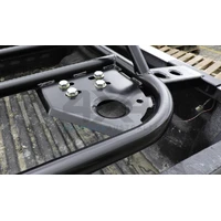 Corner plates are cut and folded 5mm plate for ultimate strength and feature dimple dies and holes for mounting points. Single mounting points are fixed at each end also to allow triangular ratchet straps to be used to fix up to 35" wheels either above or below rack, these can also be used as tie down points for strapping etc.