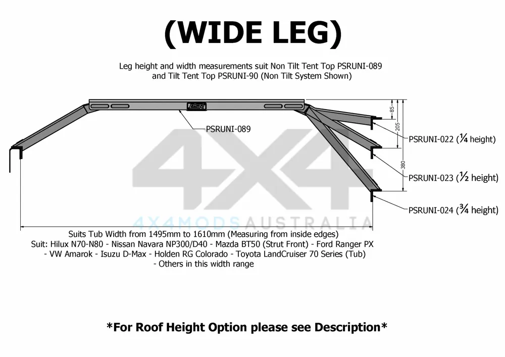 PSR has designed a Baja style Roof Top Tent mount to sit your Roof Top Tent over your tray. Suits ALL ute tubs between 1370mm and 1560mm tub width which is all your common cars, Hilux/Navara/Triton/Colorado/D-MAX/Amarok/Ranger/BT-50 etc. Powder-coated Black.