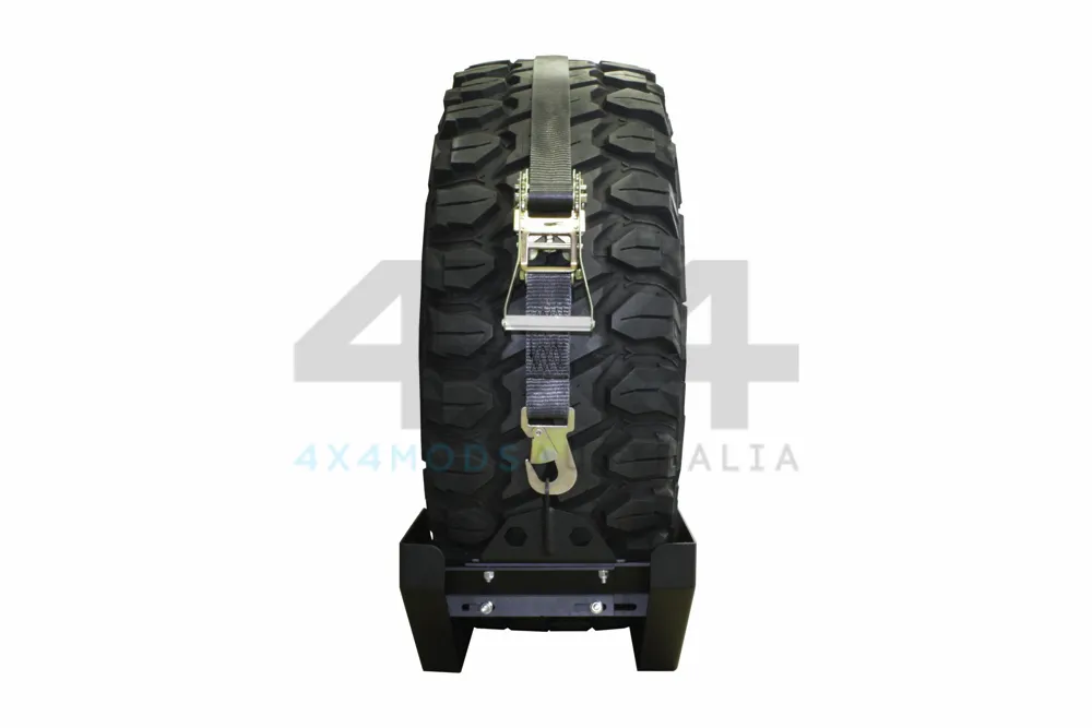 Manufactured in Australia in a powder-coated textured black finish, it bolts directly to flat tray beds and is supplied with a heavy duty ratchet strap. For those wanting to carry two spares, they can be mounted side by side or back to back.