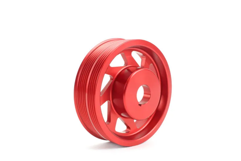 The PERRIN crank pulley is machined from 6061T6 billet aluminum, anodized black or red and laser etched for increased belt life and a precision fit.