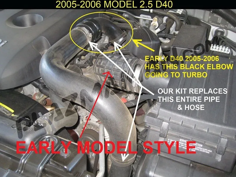NOTE - This Hot Piping Kit is to suit early model Navara, with the black metal elbow coming out of the turbocharger compressor housing. Please see the engine bay image for reference. The mid model (2007-2011) Navara's have a an extended aluminium cast elbow from the turbocharger, and the later models (2011 Onwards) have a short cast aluminium elbow.