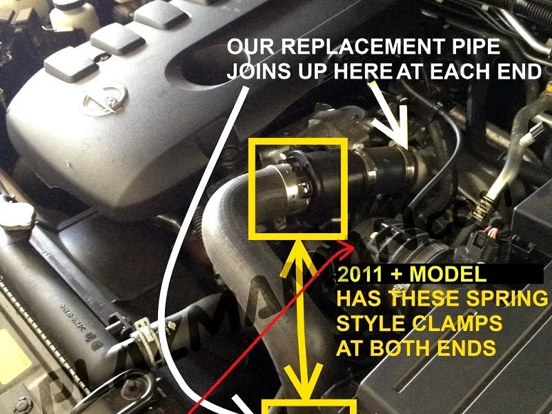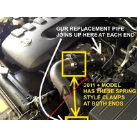 This Hot Piping Kit is to suit late model (2011 onwards) Navara's, which have a short aluminium cast elbow from the turbocharger outlet. The factory rubber hose is held in place with a "spring circlip". Some 2011 models came out with the extended cast aluminium outlet elbow, and 2 standard style hose clamps holding the factory rubber in place. You may need the 2007-2011 version if this is the case (see related items).