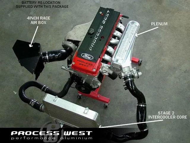 The Process West Stage 2 Front Mount Intercooler Core for the Ford BA/BF Falcon is a 500 x 360 x 80mm bar & plate core, with hi-flow polished aluminium end tanks. This allows for smooth flow and effective cooling of the charge air entering the engine. Includes cold-side intercooler piping with lightweight mandrel bent aluminium piping.
